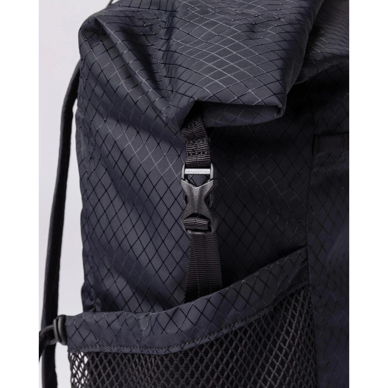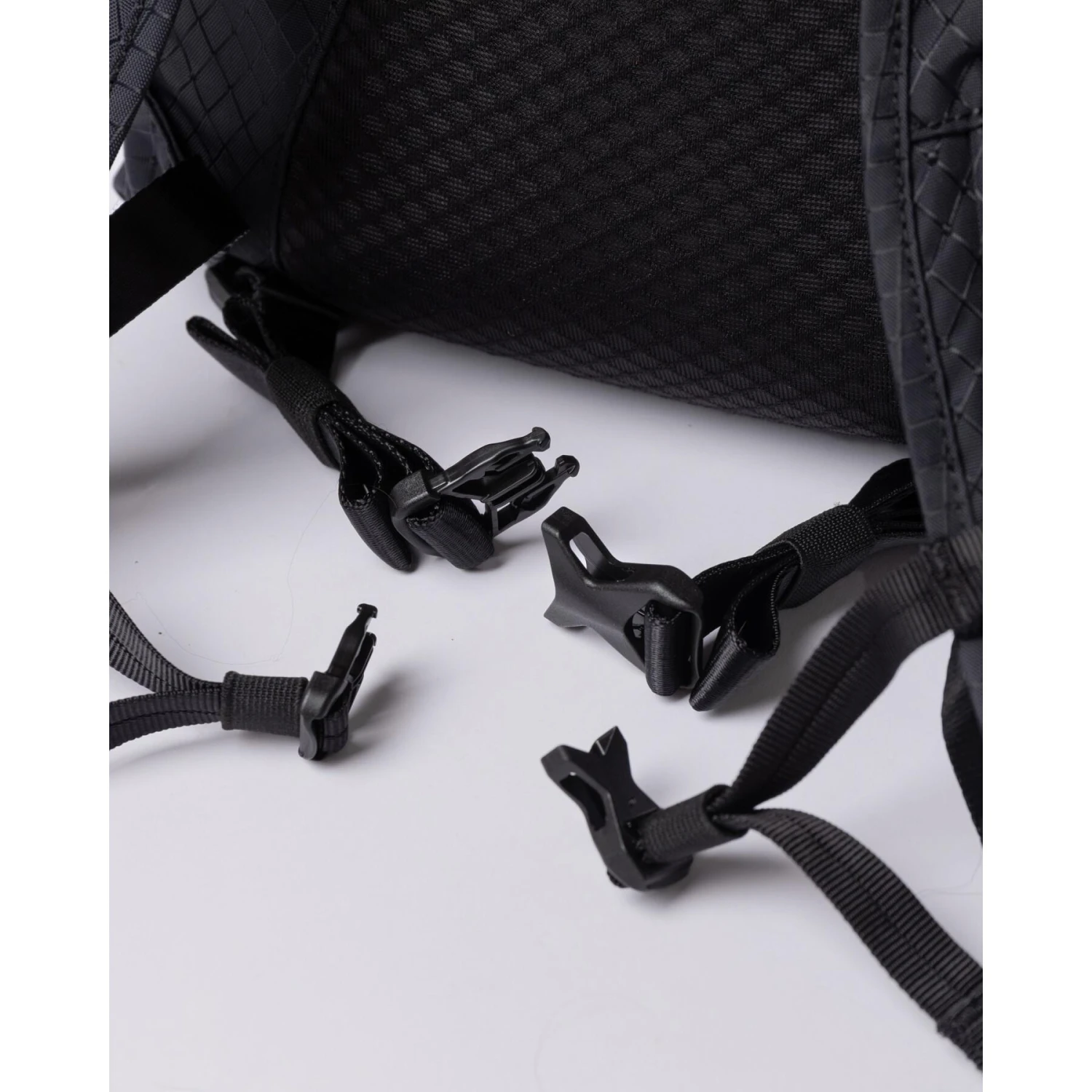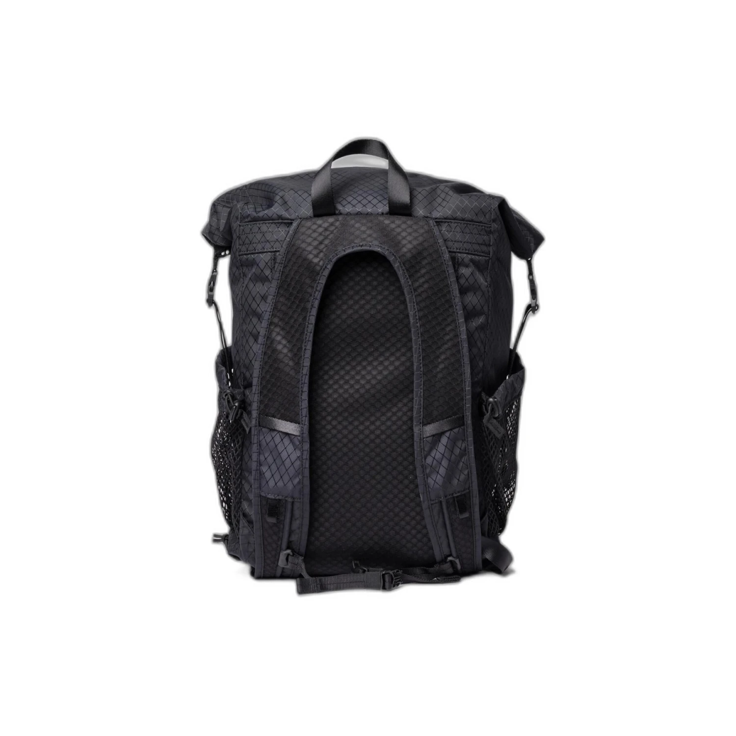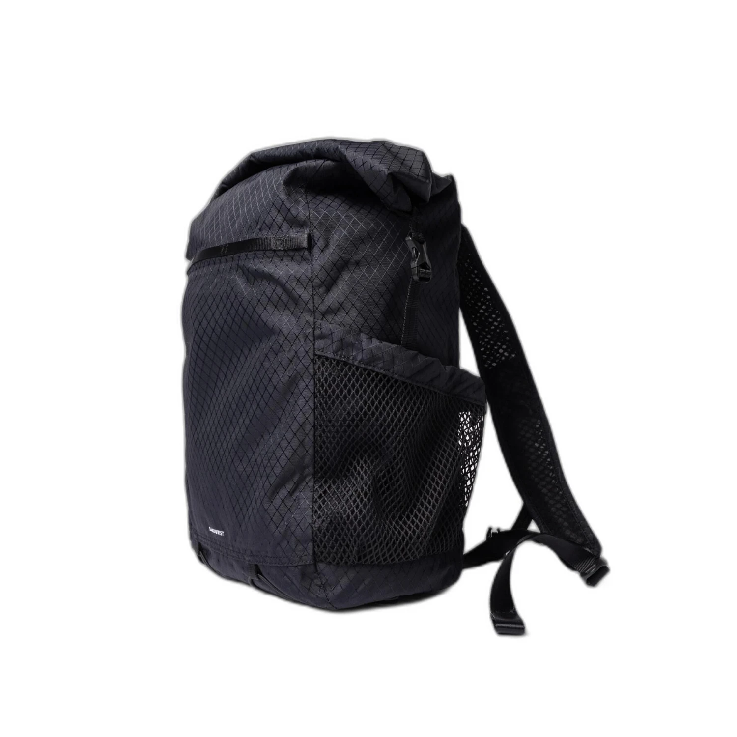 Rolling backpack in 100% recycled diamond ripstop. Features snap and zipper closure, large mesh side pockets, drawstring, adjustable side straps, adjustable shoulder straps and chest strap, ergonomic mesh back padding, removable belt, interior pocket and interior zippered pocket. Carries between 10 and 25 L