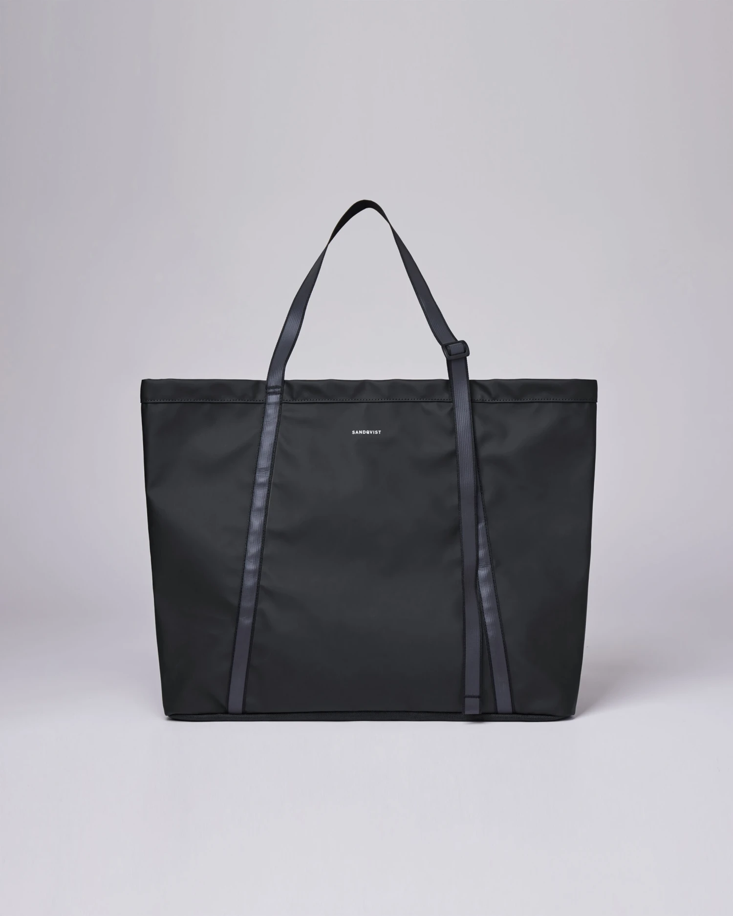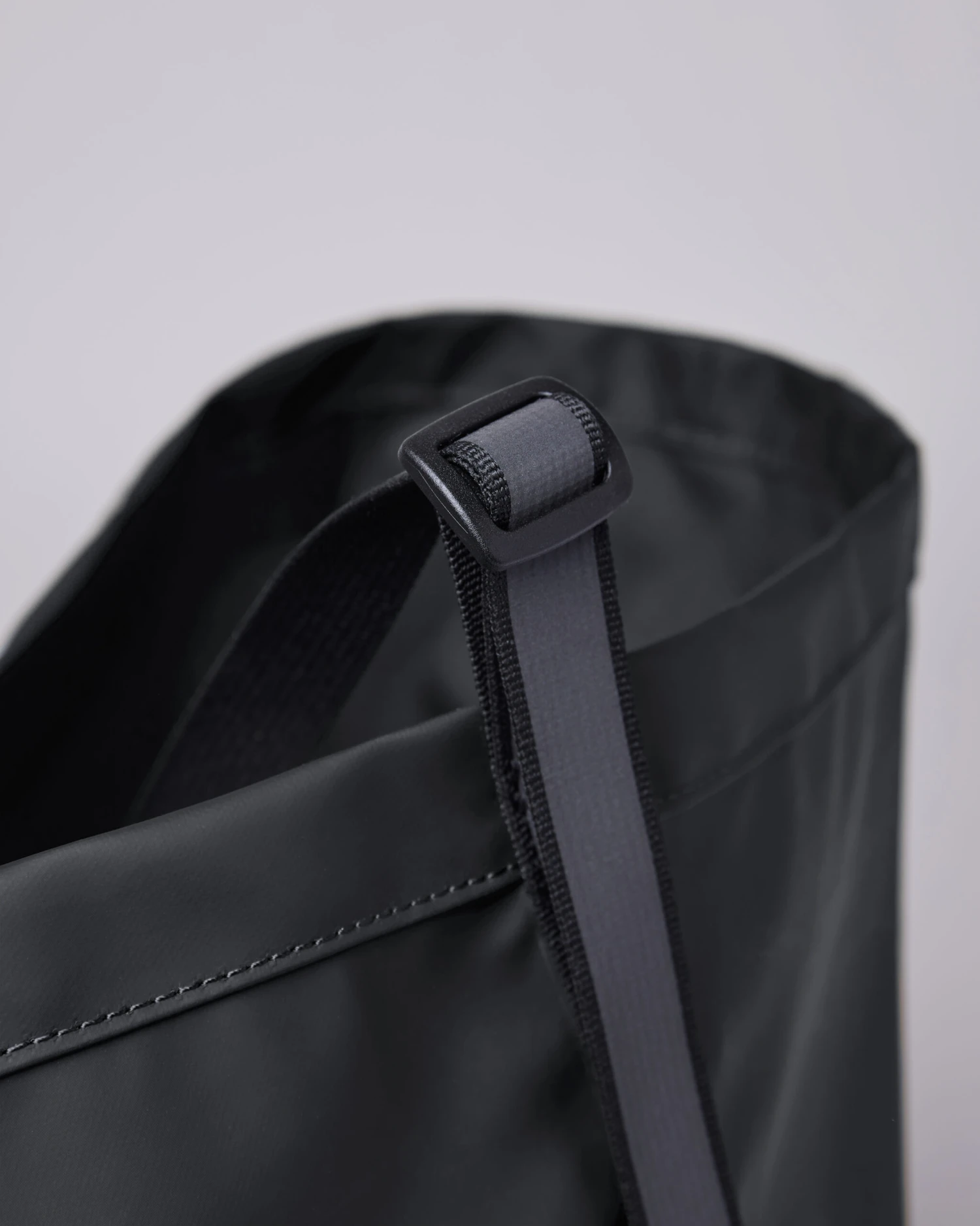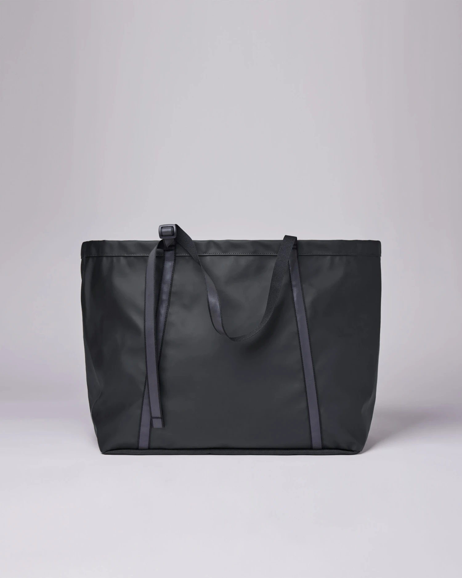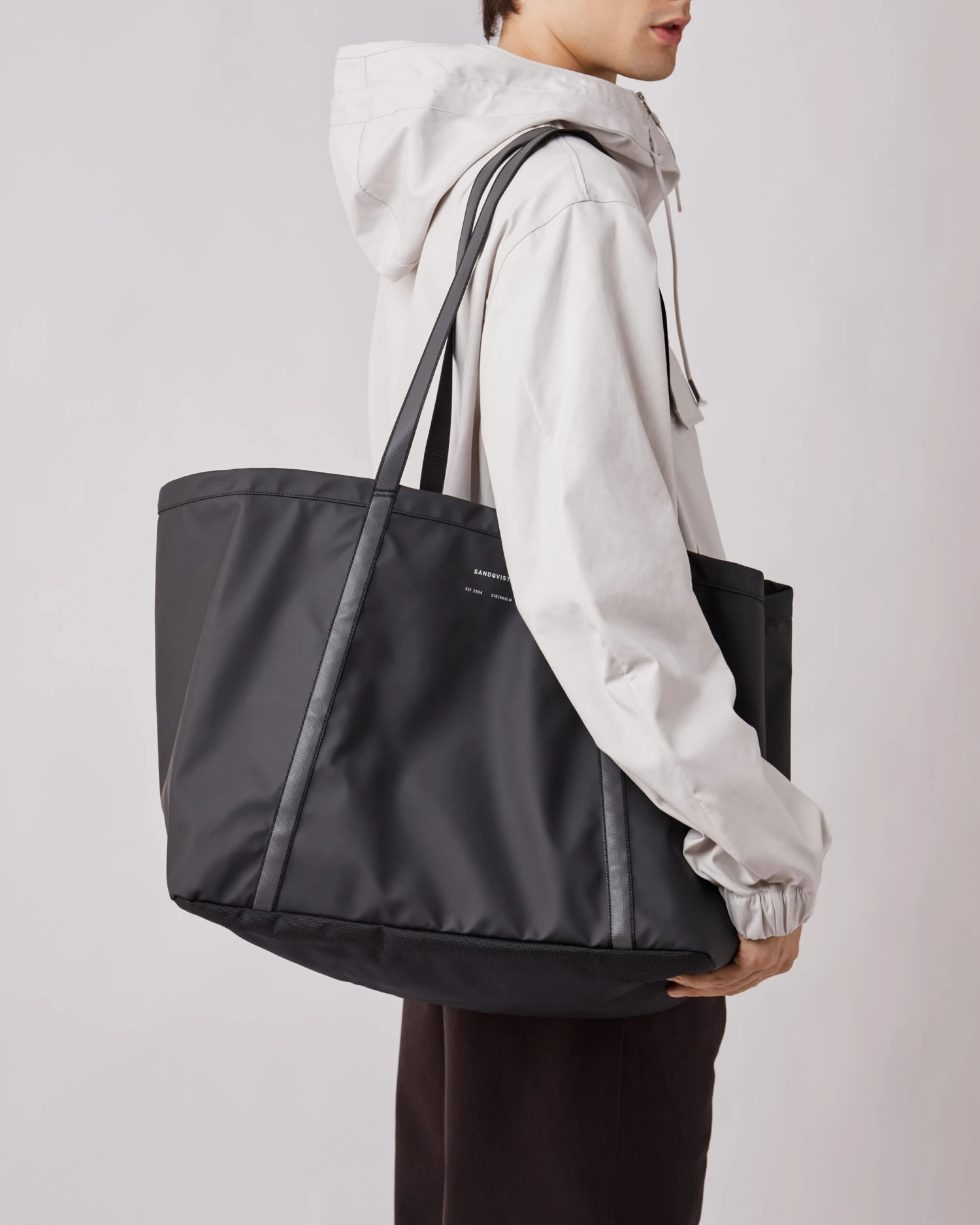Spacious tote bag in crinkled twill made from 100% recycled nylon, constructed with a soft padding. The bag features outer slip pockets for water bottles or other essentials to bring from work to workout.