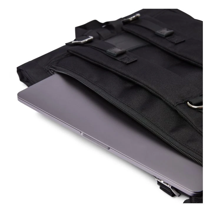 - Short handle(s), Lined, Top stitched, Embossed logo, Zipped pocket(s) on the back, Mesh pocket(s), Worn on shoulder, Worn on hand, Strap(s), Zipped front pocket, Sewn-in brand label, Main compartment, Adjustable straps, Metal ring(s)