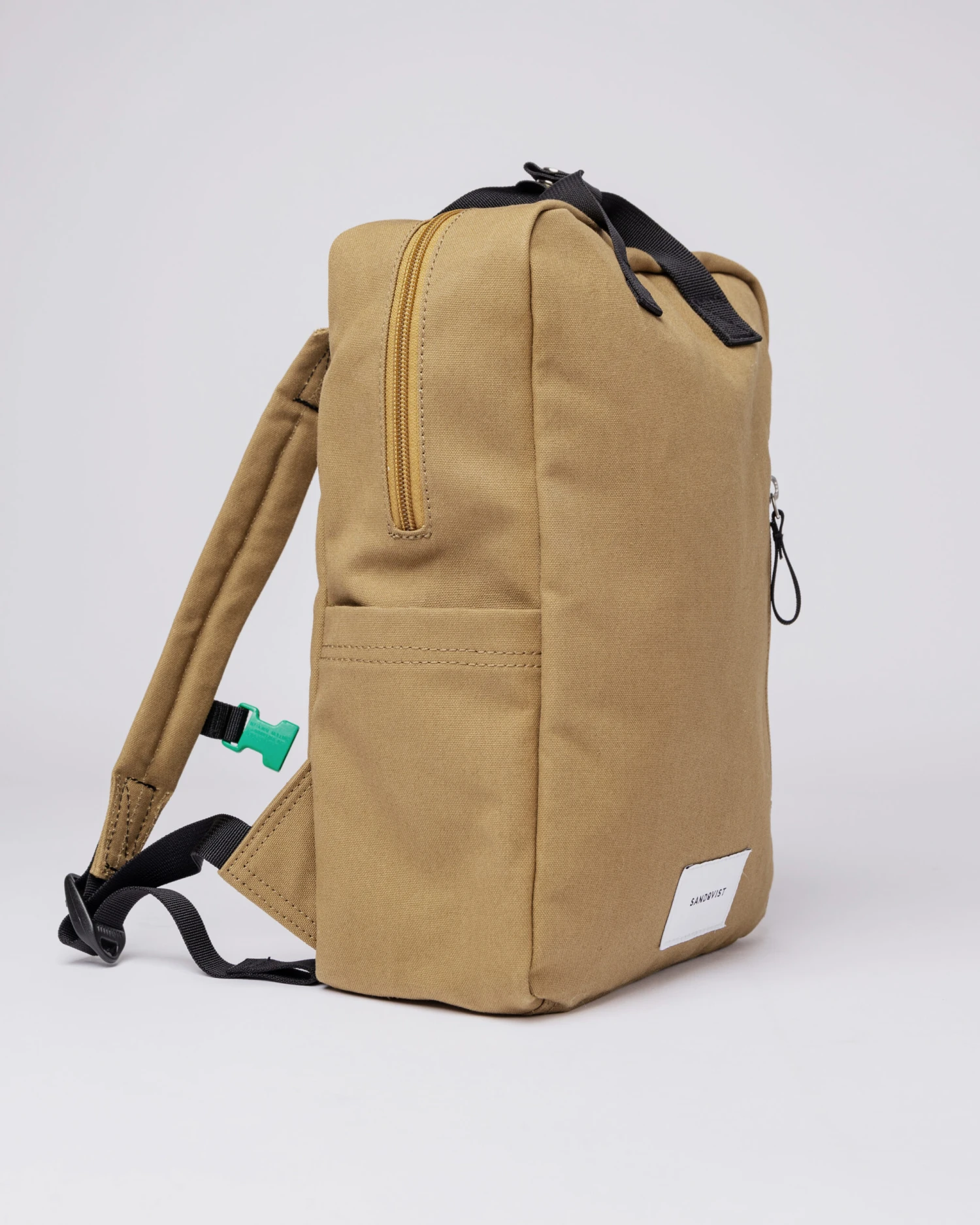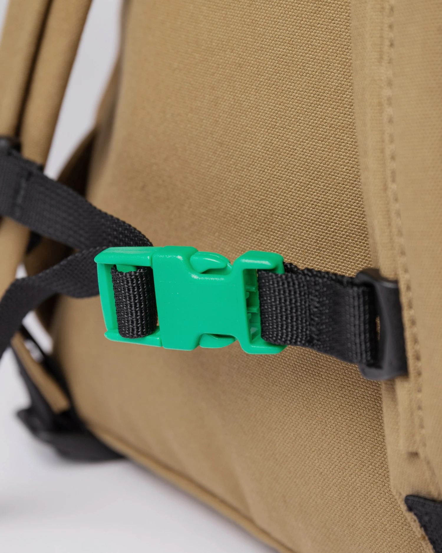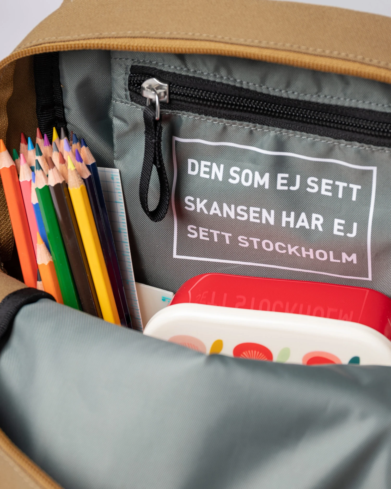 Backpack for kids made of surplus materials in an organic cotton and recycled polyester mix, developed in collaboration with Skansen in Stockholm. The bag is designed with a green quick release safety buckle, which releases if the child gets caught in the bag. The bag features an inner and outer zip pocket and two side pockets. The simple zipper opening, 8 L capacity, and functional pockets make this bag a perfect bag for preschool and adventures for children between the ages of 2-6.