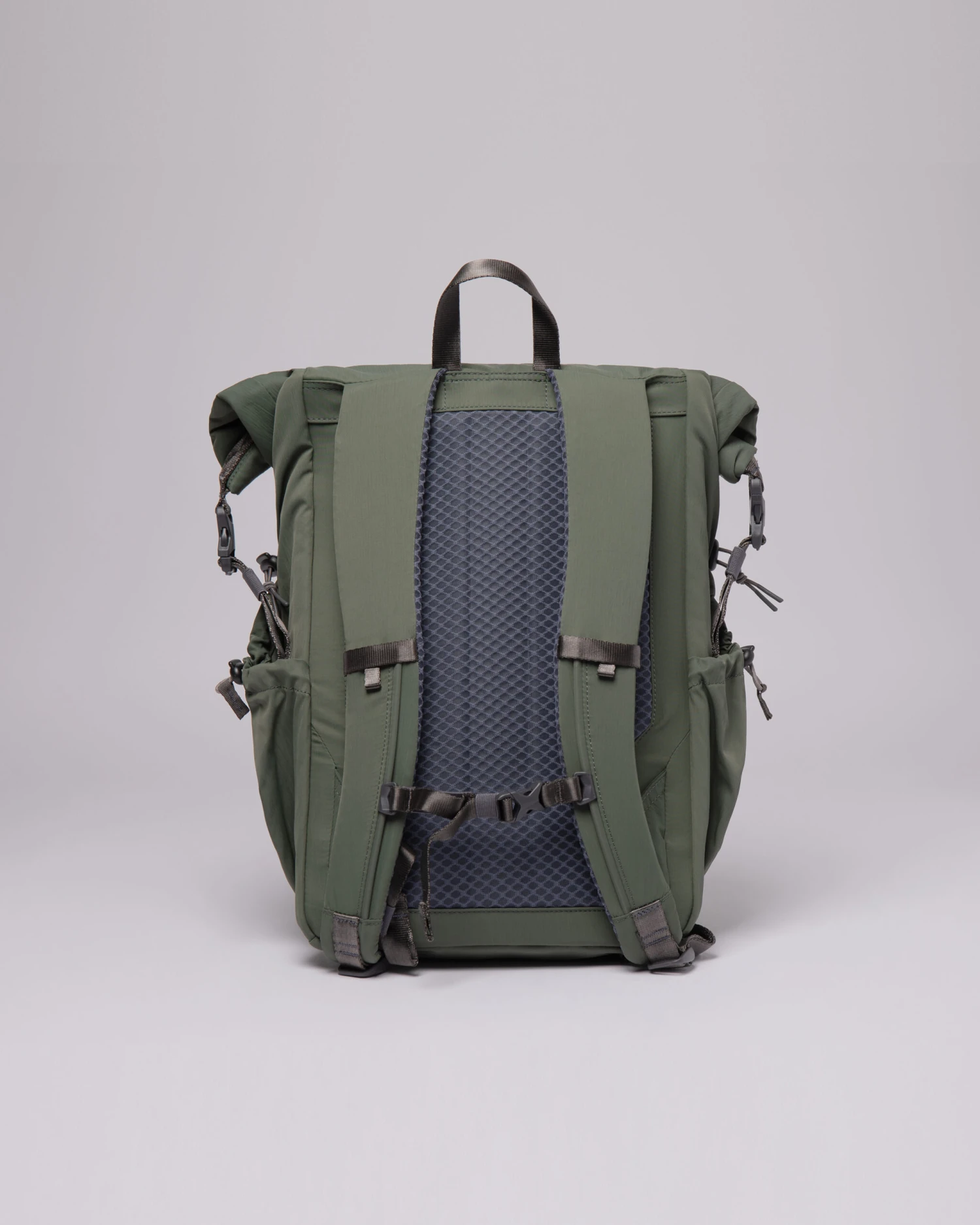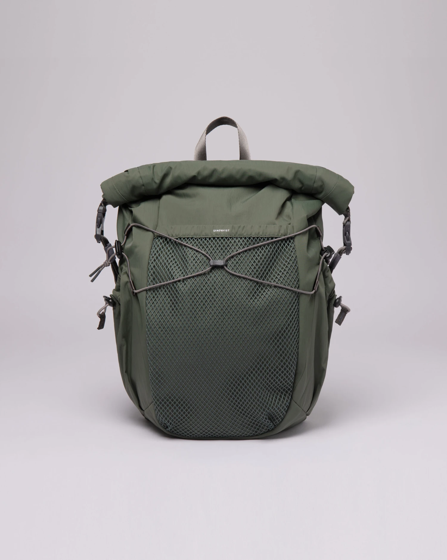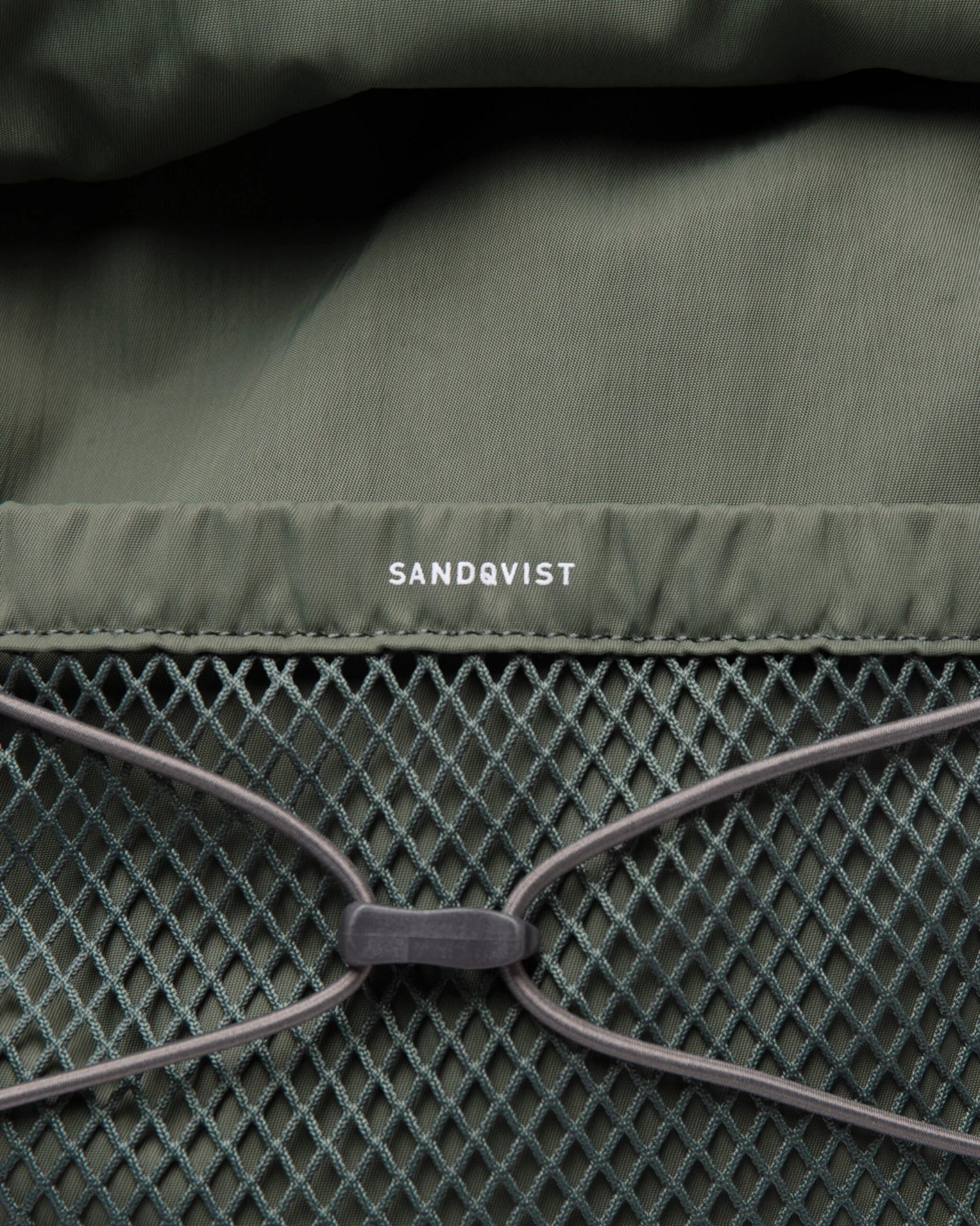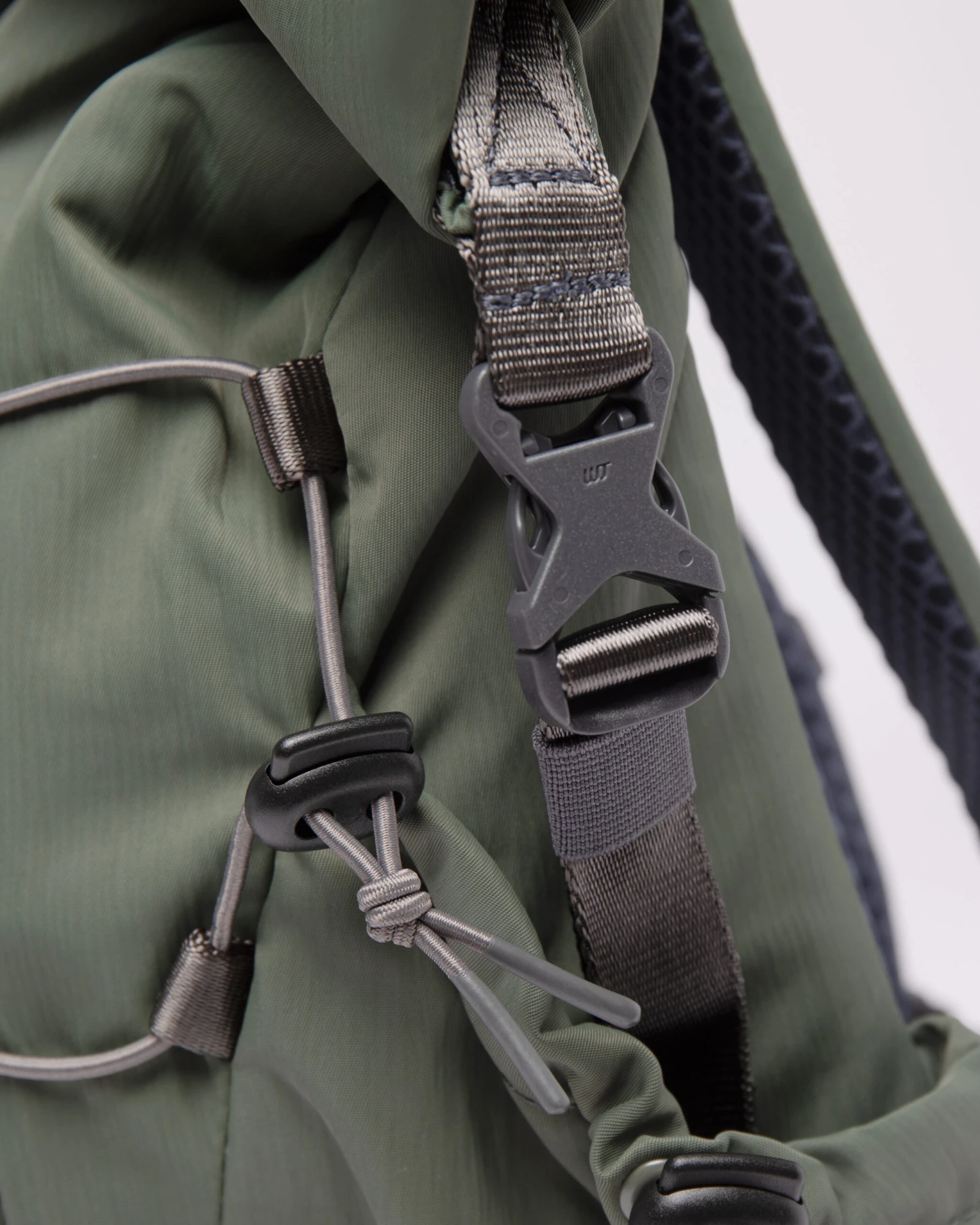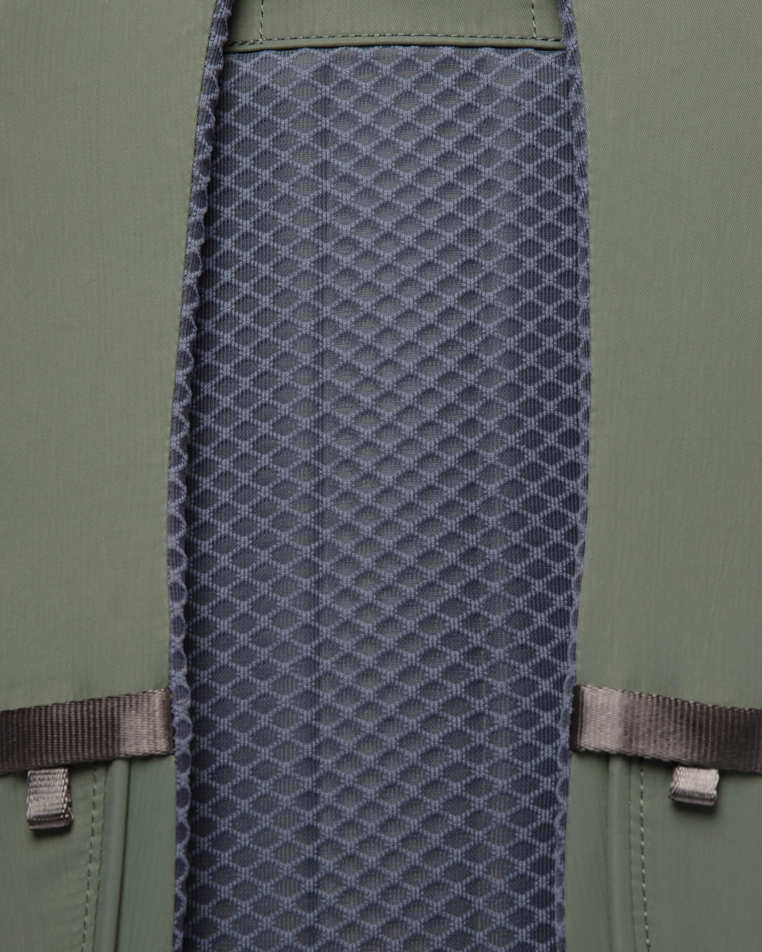 Technical backpack in crinkled twill made from 100% recycled nylon with either rolltop or canoe closure. The bag features a large mesh pocket and cord details for fastening your yoga mat, making the commute from work to workout a breeze.