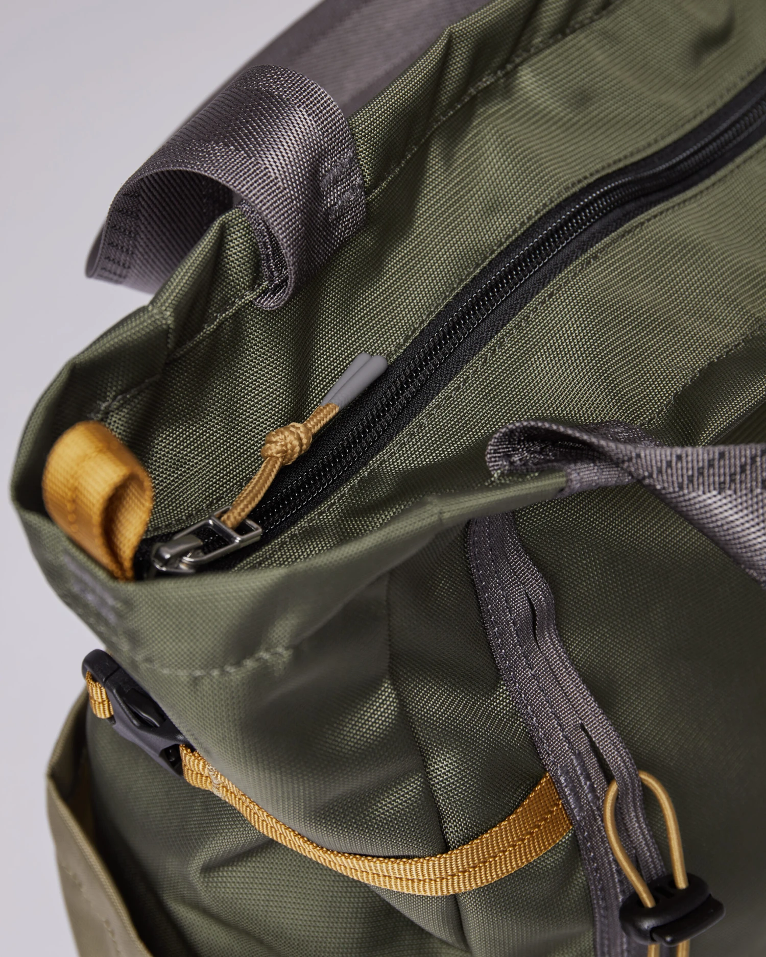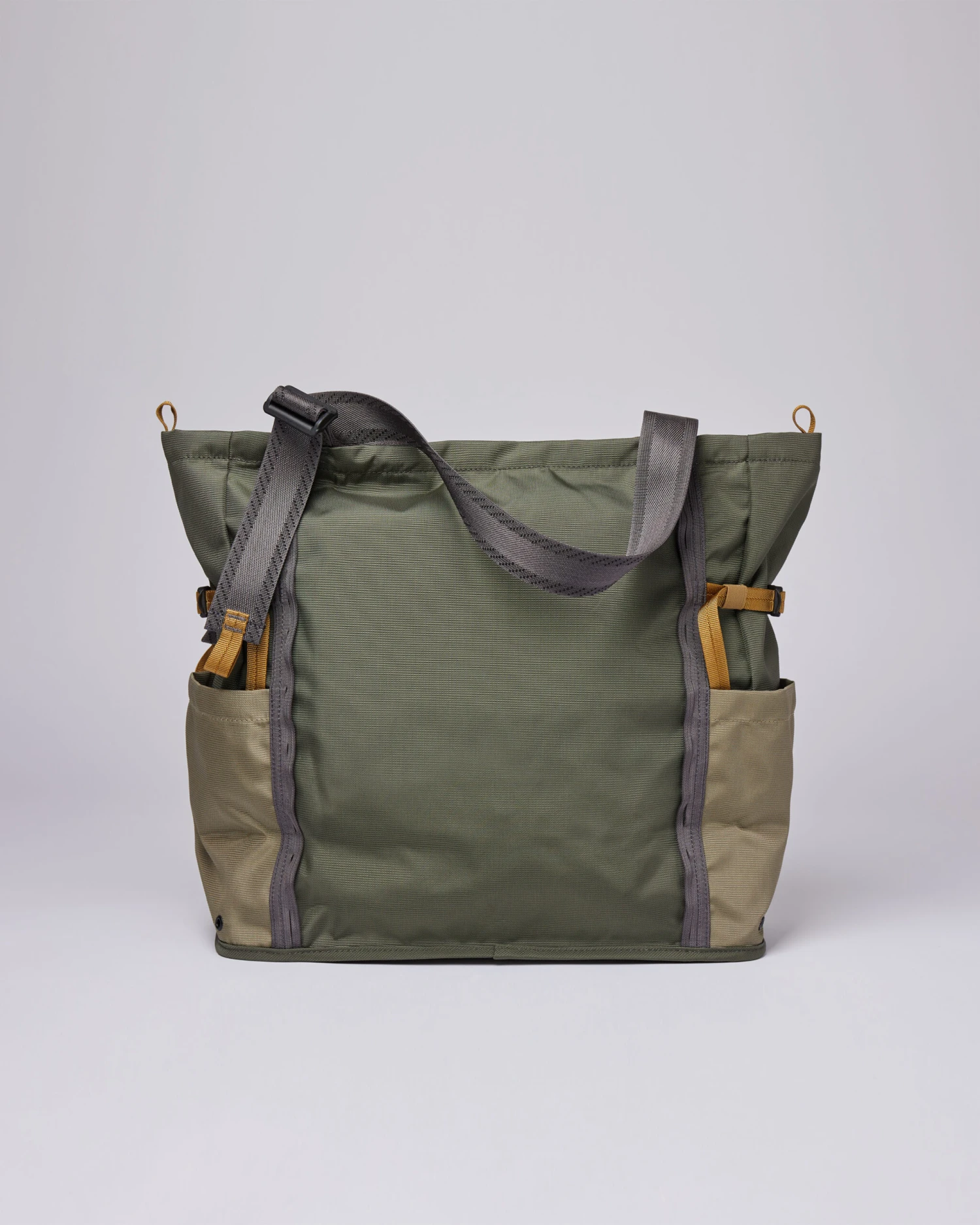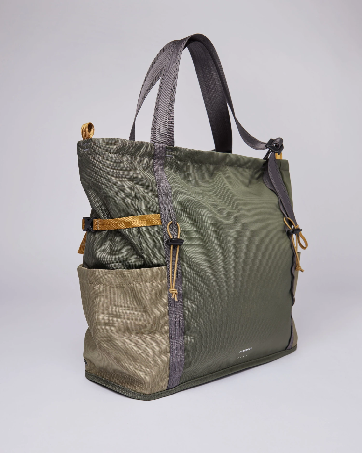 Functional tote bag made from 100% recycled nylon. It is constructed with adjustable handles and pockets on the side. A tote bag expertly crafted from sustainable fabrics, with technical details and function at its core.