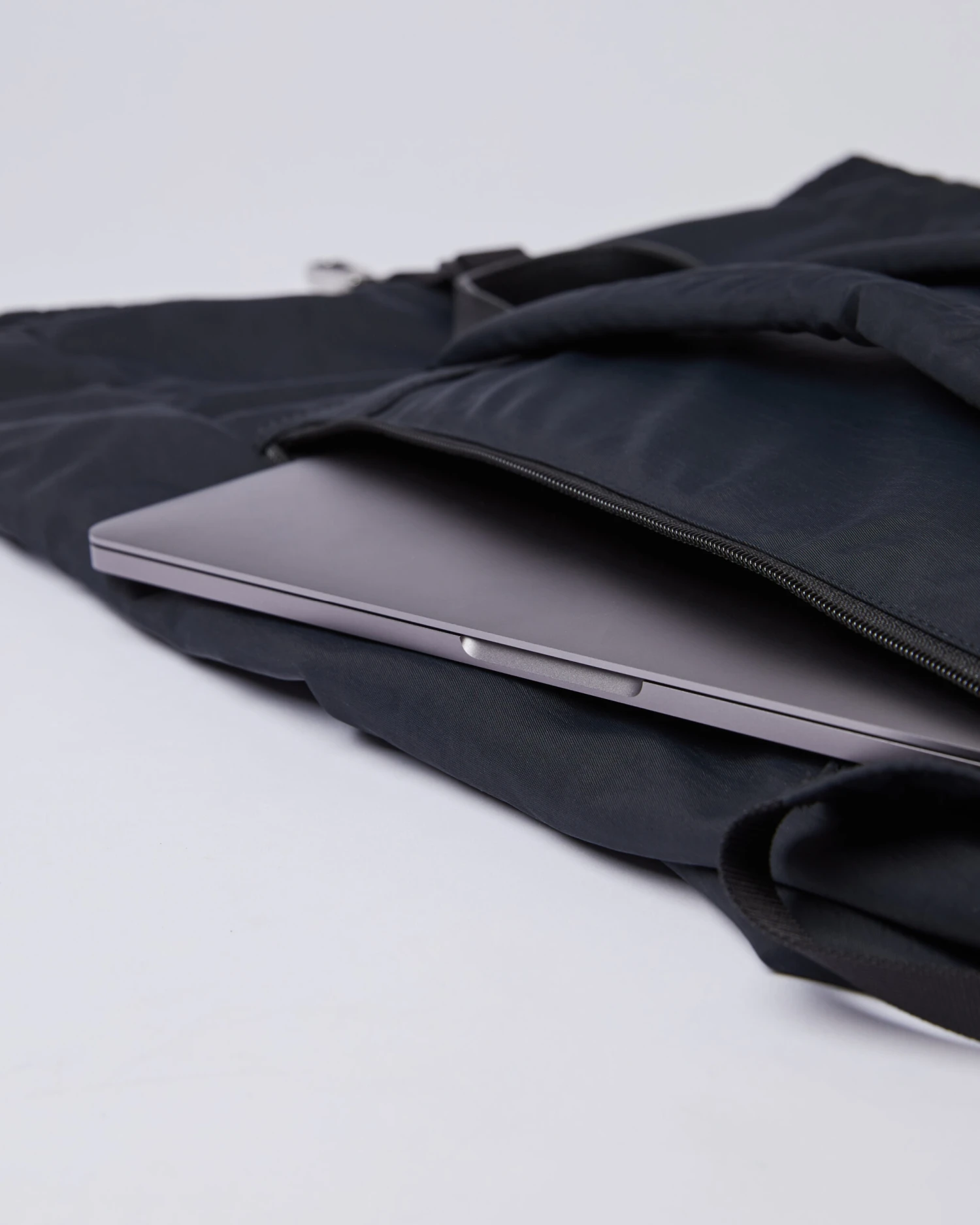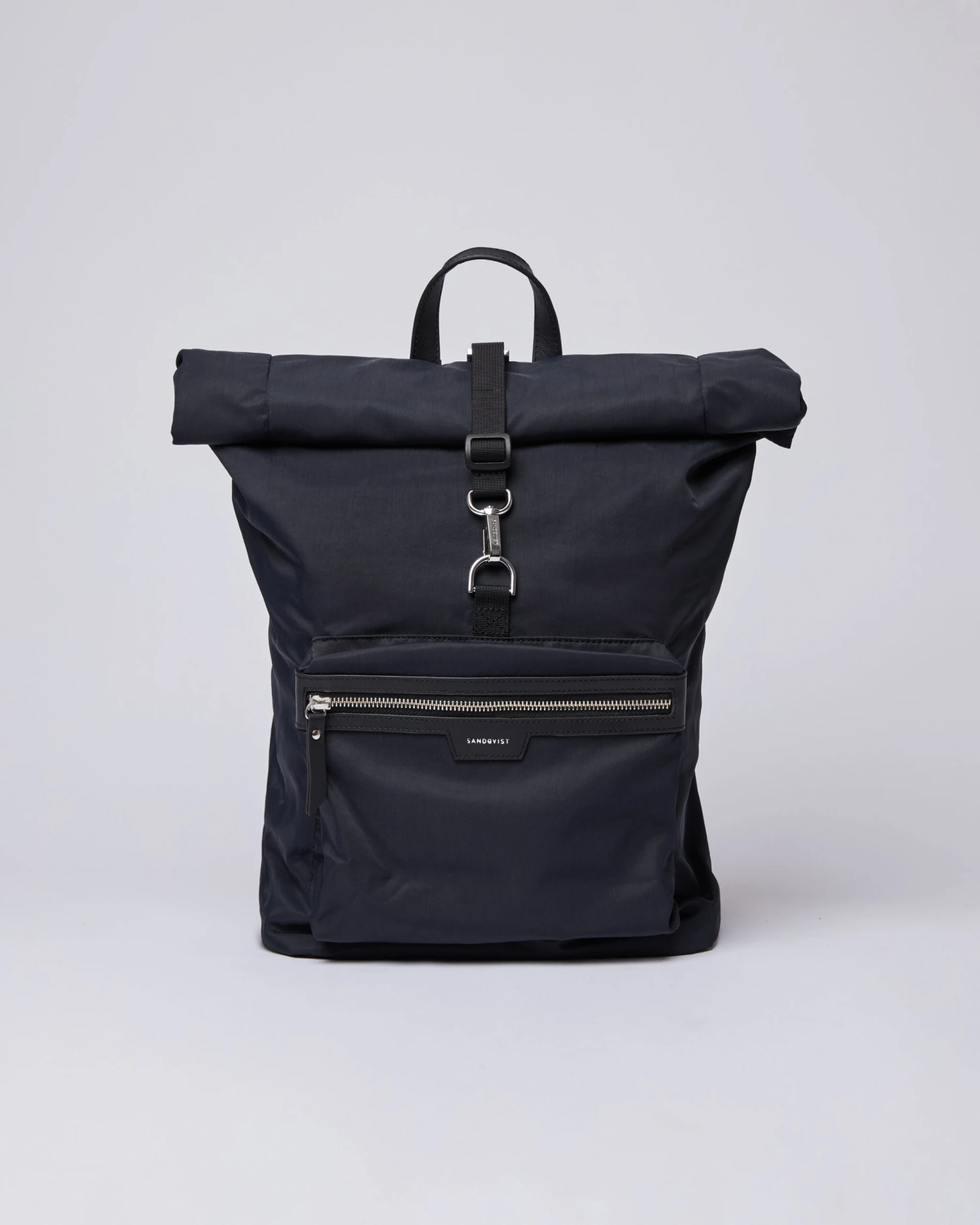 This elegant and modern rolltop backpack from our Fusion series is made with recycled nylon and high-quality leather details. Zipper and front metal hook closure with an adjustable strap. External laptop compartment fits most 13â models. The outer front pocket allows for easy access to frequently used items. Lightweight and comfortable, making it the perfect bag to accompany you from work to workout with ease.