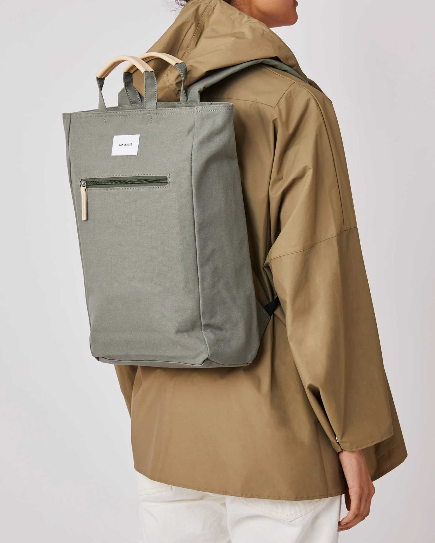 This minimalistic backpack from our Ground series is produced from an organic cotton and recycled polyester mix with smooth leather details. The bag features a 15″ laptop pocket, one outer zipper pocket and can carry up to 13 L. With the top handle you can carry the backpack as a tote bag as well, perfect for the daily commute..