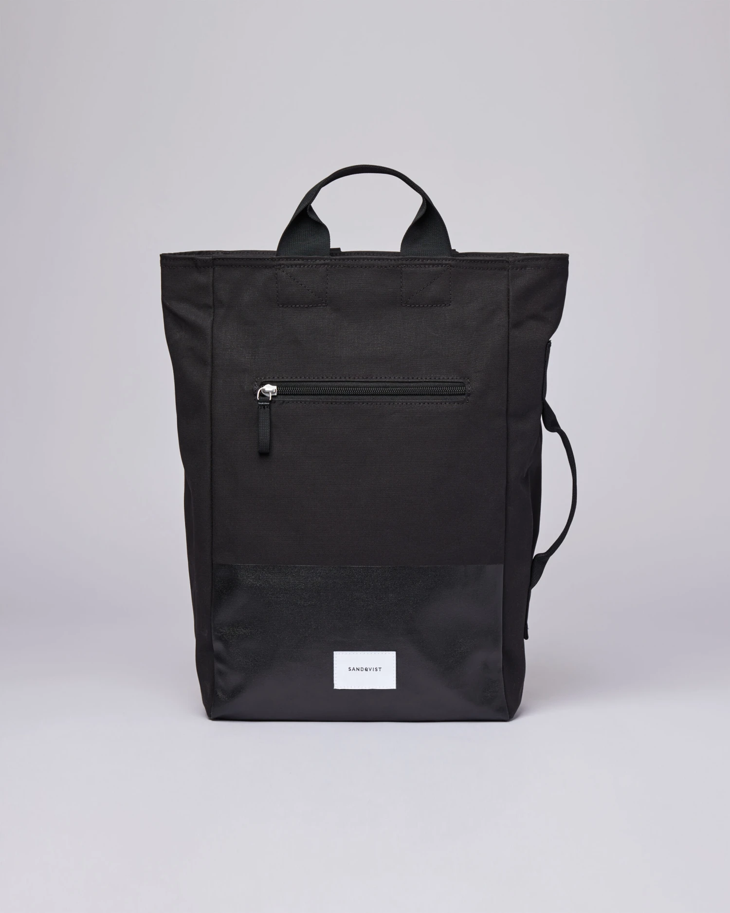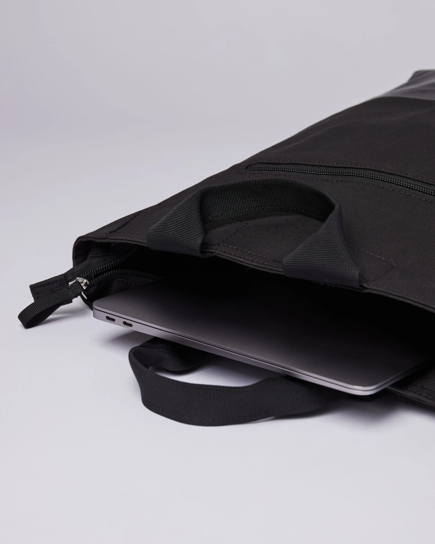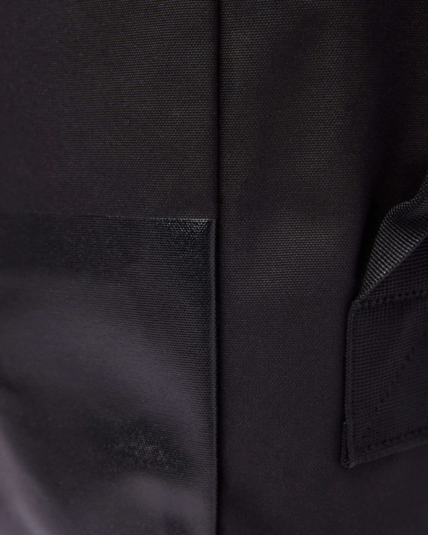 Backpack in organic cotton and recycled polyester mix. A 100% vegan bag featuring a 15″ laptop pocket, one outer zipper pocket, and can carry up to 13 L. The bottom and front of the bag is treated with a silk print coating for extra water resistance.