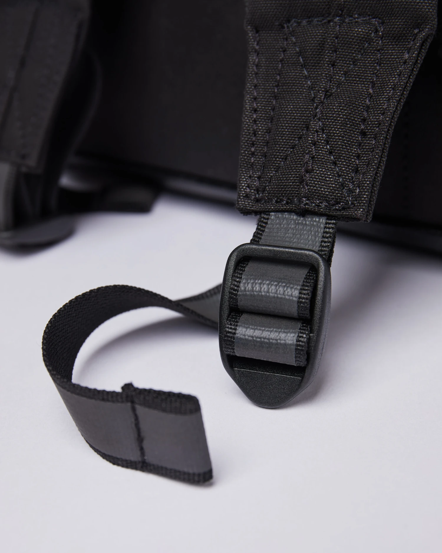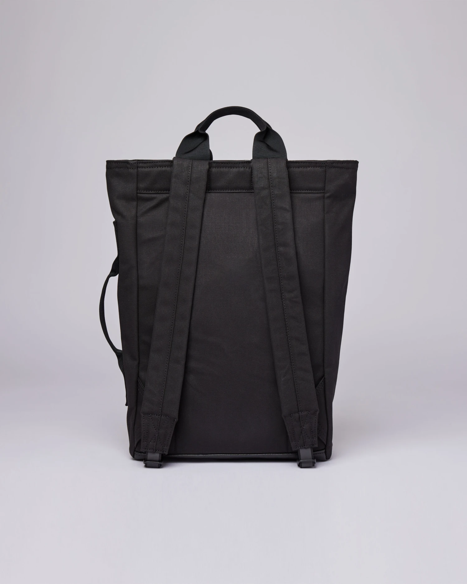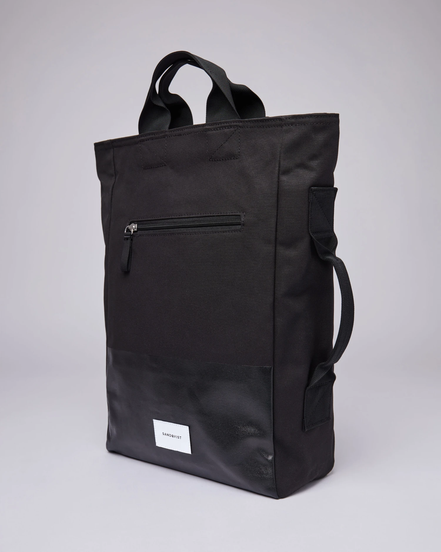 Backpack in organic cotton and recycled polyester mix. A 100% vegan bag featuring a 15″ laptop pocket, one outer zipper pocket, and can carry up to 13 L. The bottom and front of the bag is treated with a silk print coating for extra water resistance.