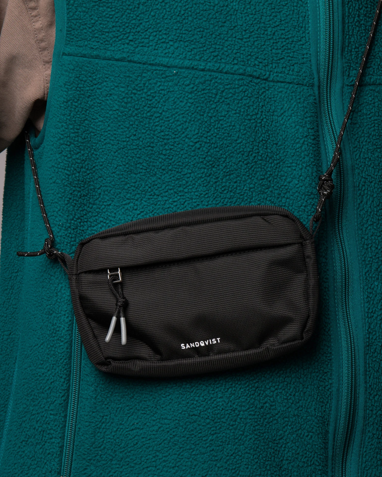 Universal hip bag constructed in 100% recycled regen robic nylon that serves as a perfect add on organizer for smaller items. Fasten it horizontally or vertically on your belt or backpack. It also features a cord that can be used to hang the bag over your shoulder or around the neck.
