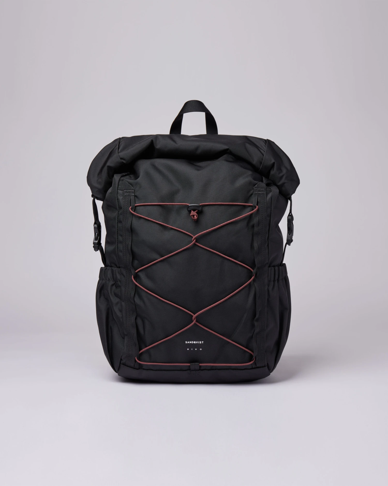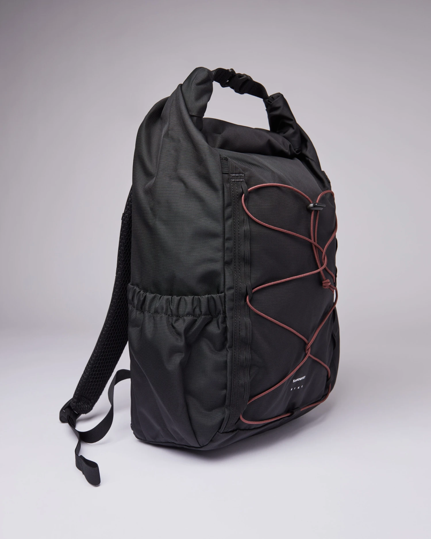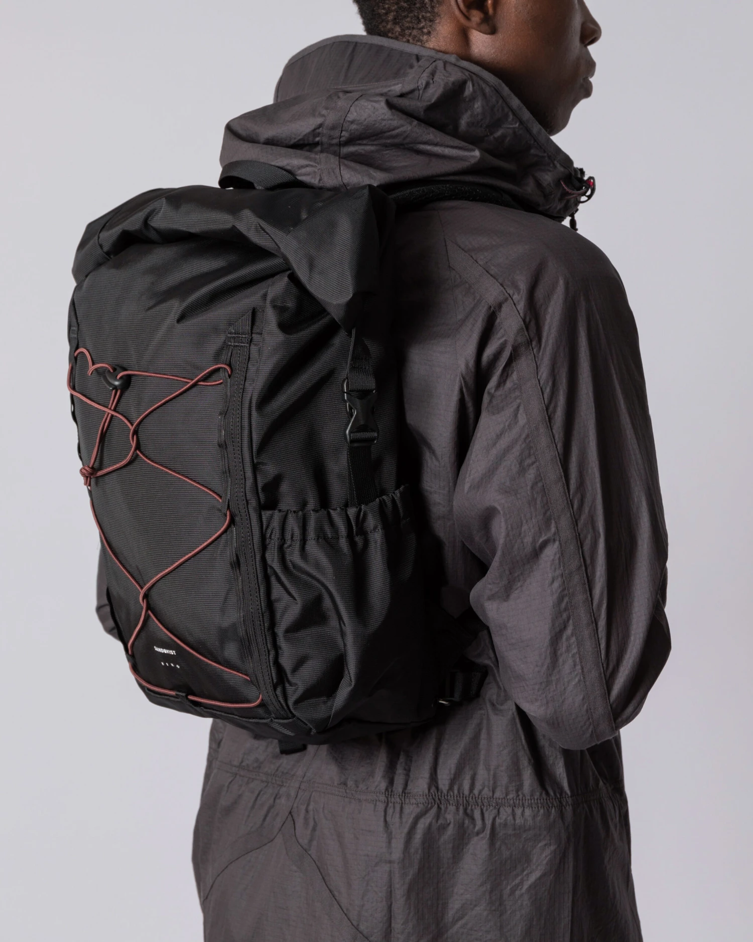 High-performance backpack. Functionality includes gear loops, cord detailing, compressions straps, side pockets, a removable hip belt and a two-way rolltop and buckle closure. Expertly crafted from sustainable fabrics, with technical details and function at its core.