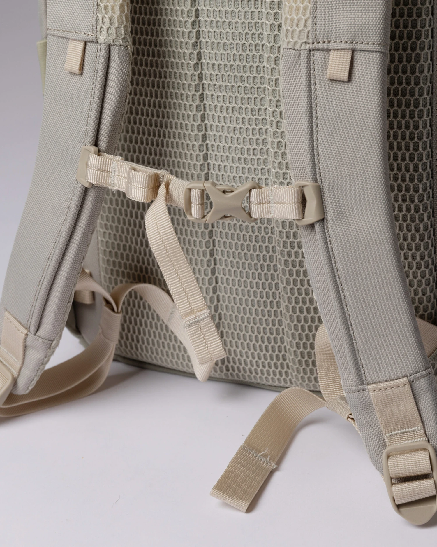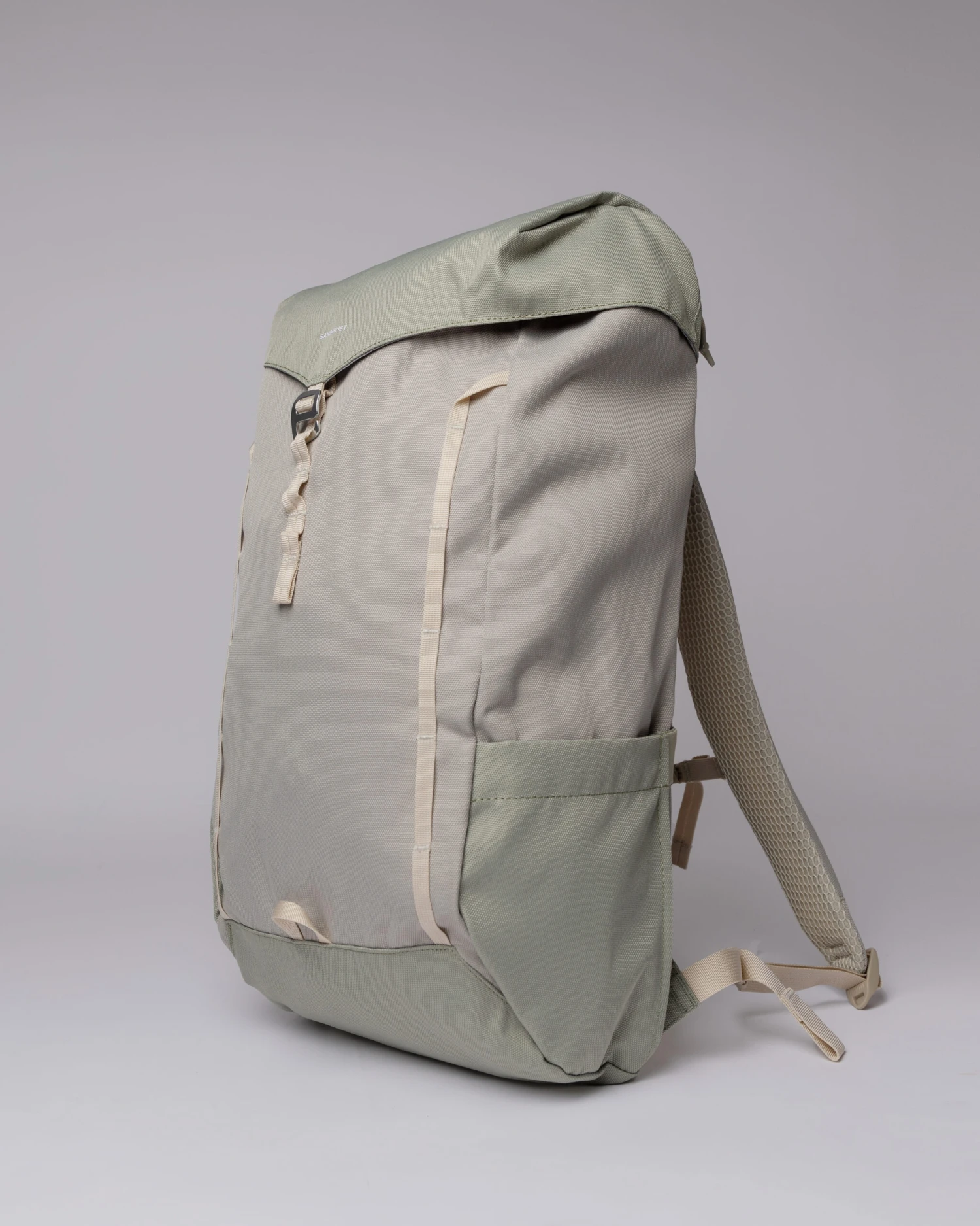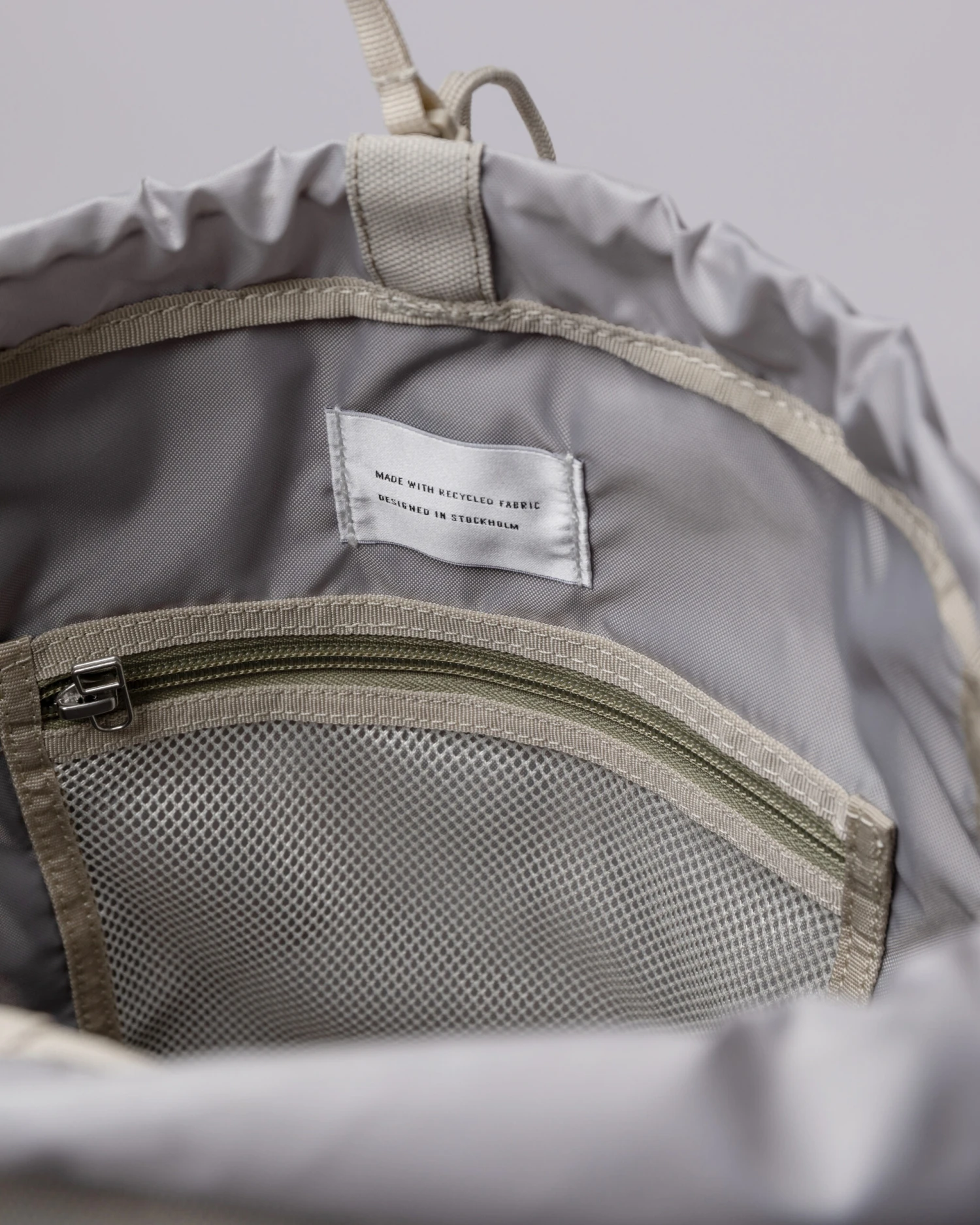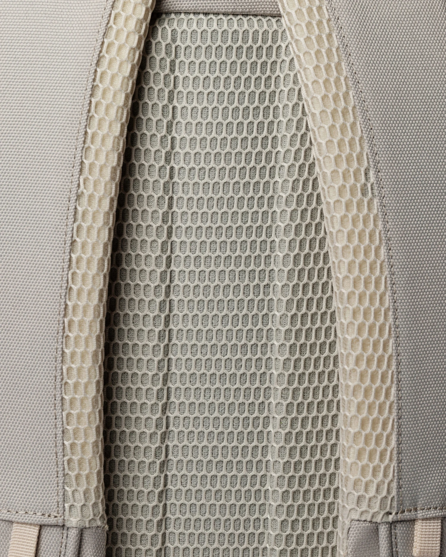 Water-resistant and spacious backpack constructed in 100% recycled polyester. It features a 16″ laptop compartment and can carry up to 19 L.